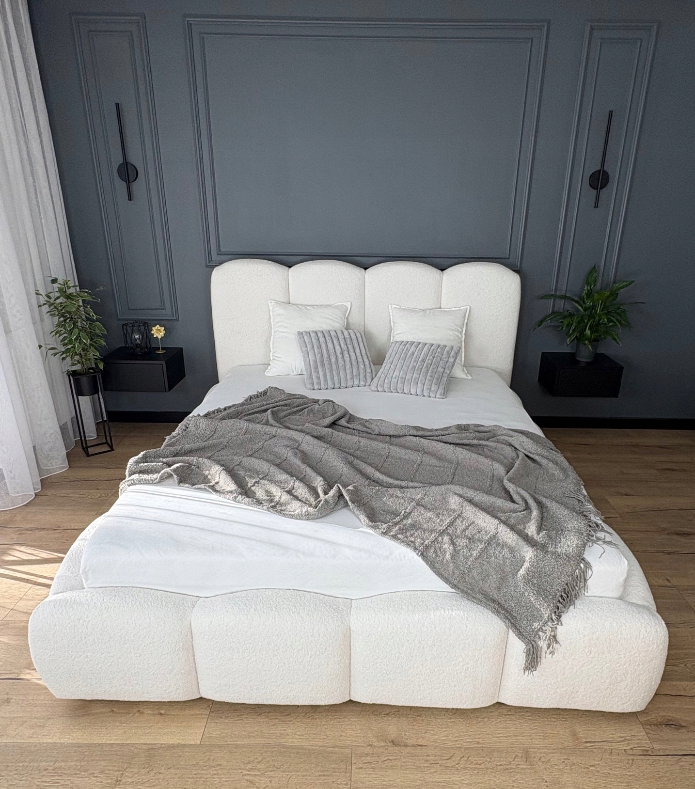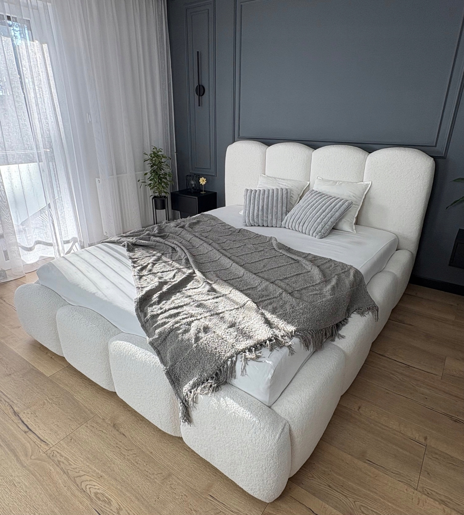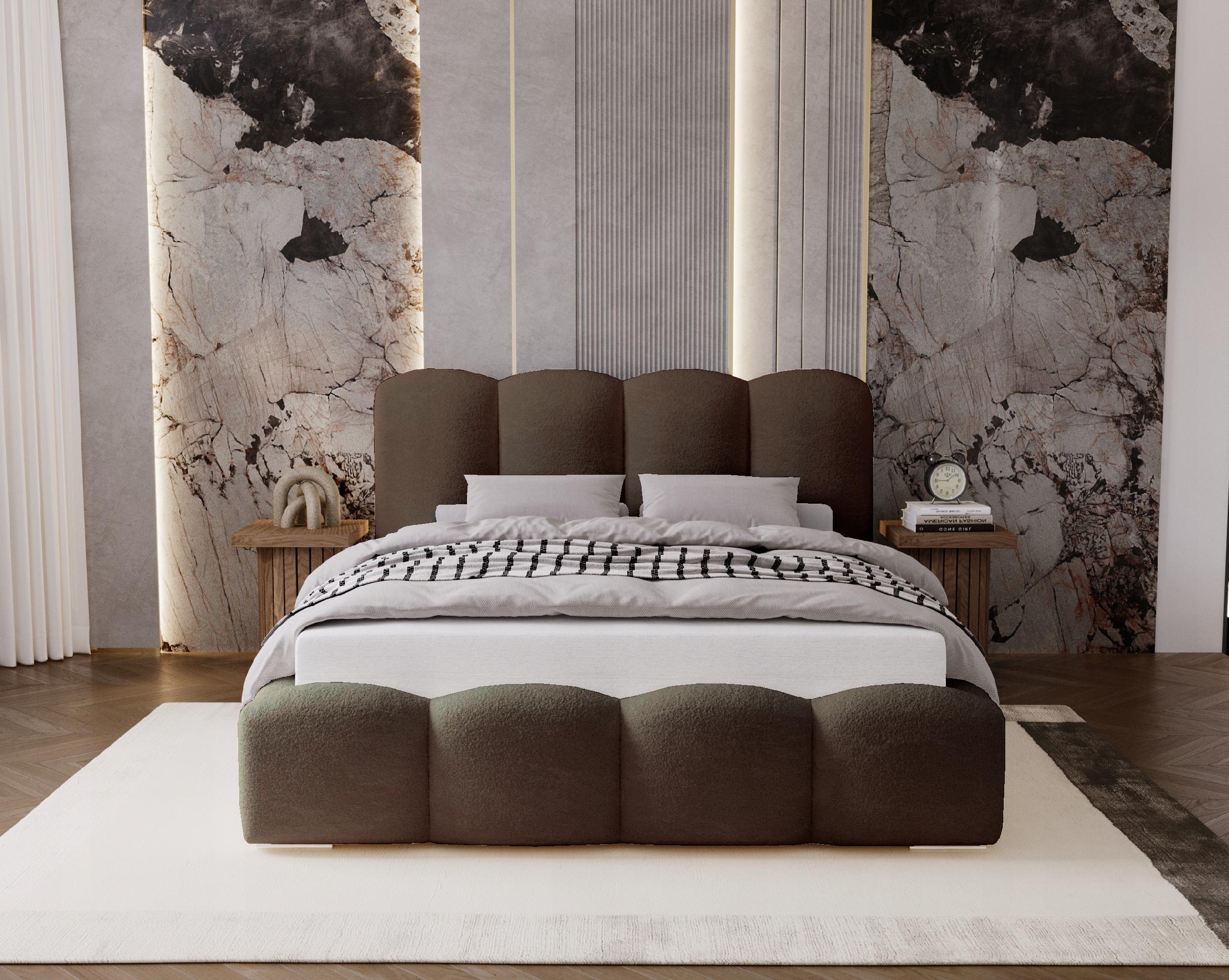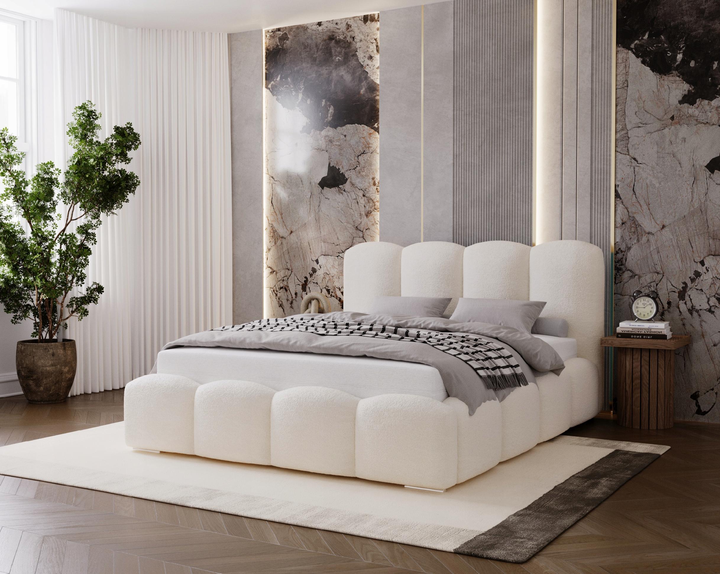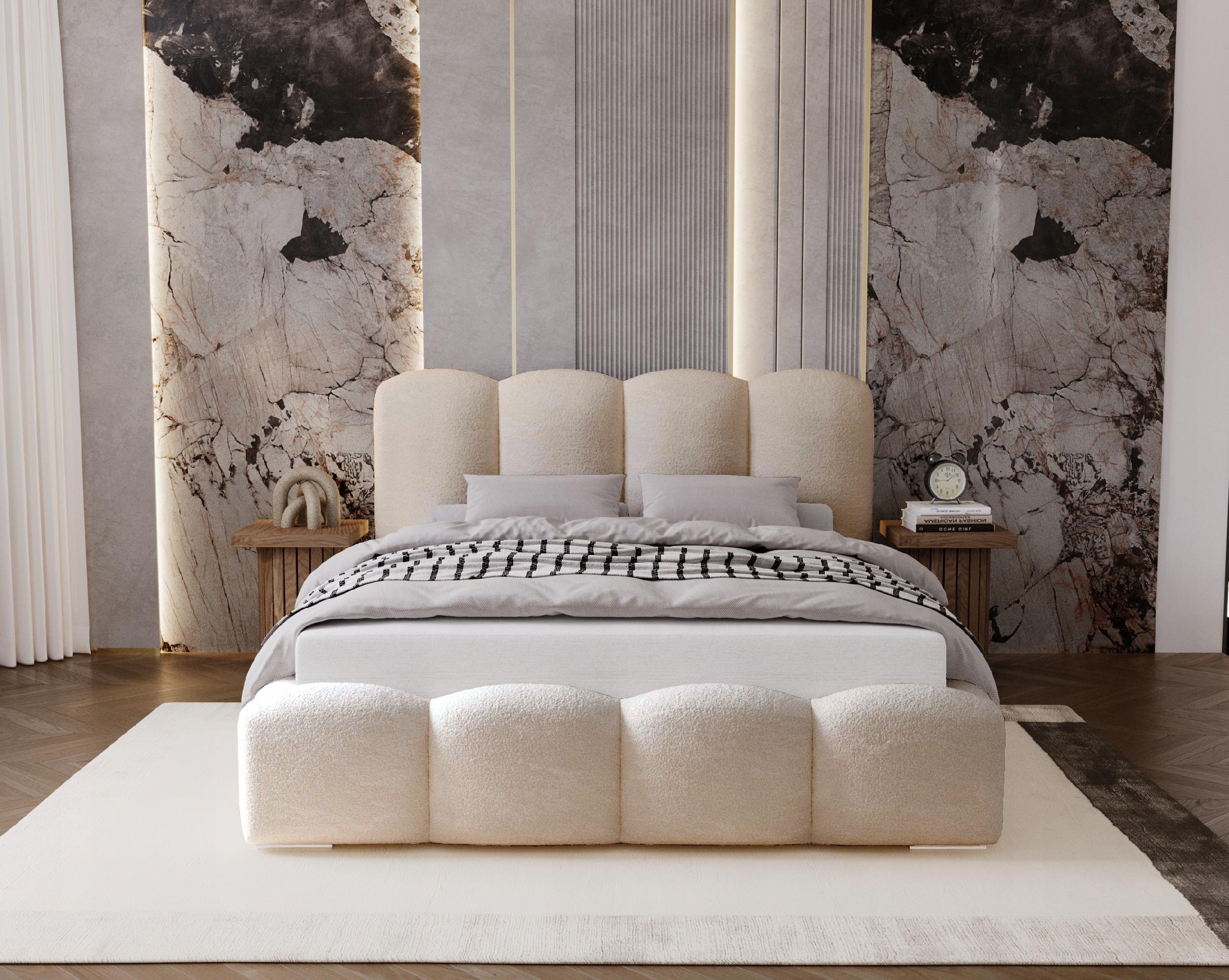 Łóżko zostało obite tkaniną boucle – miękki baranek, niezwykle przyjemną w dotyku i idealną do nowoczesnych wnętrz. Gruba, miękka pianka zastosowana na całej konstrukcji zapewnia wysoki komfort codziennego użytkowania oraz wygodny wypoczynek.