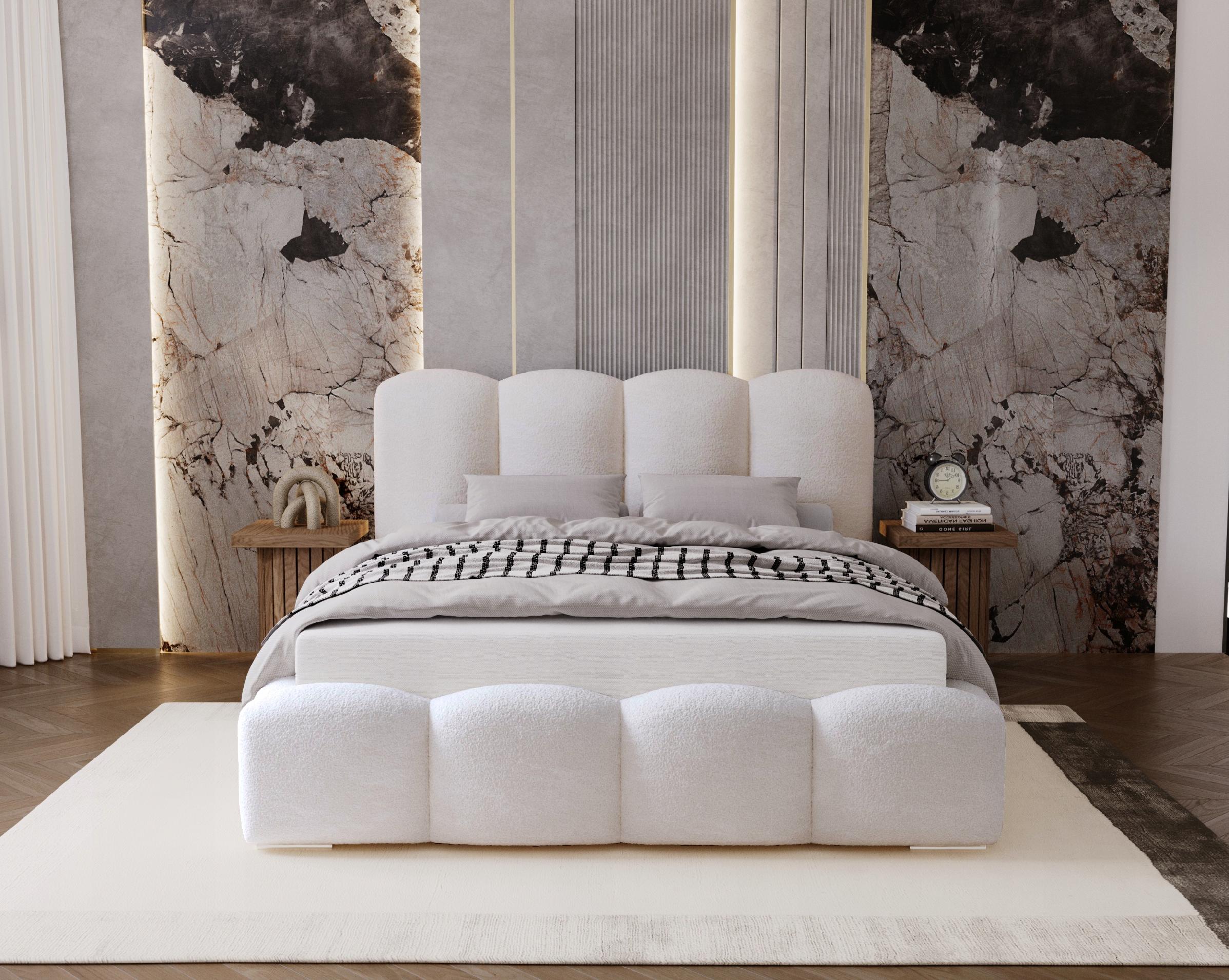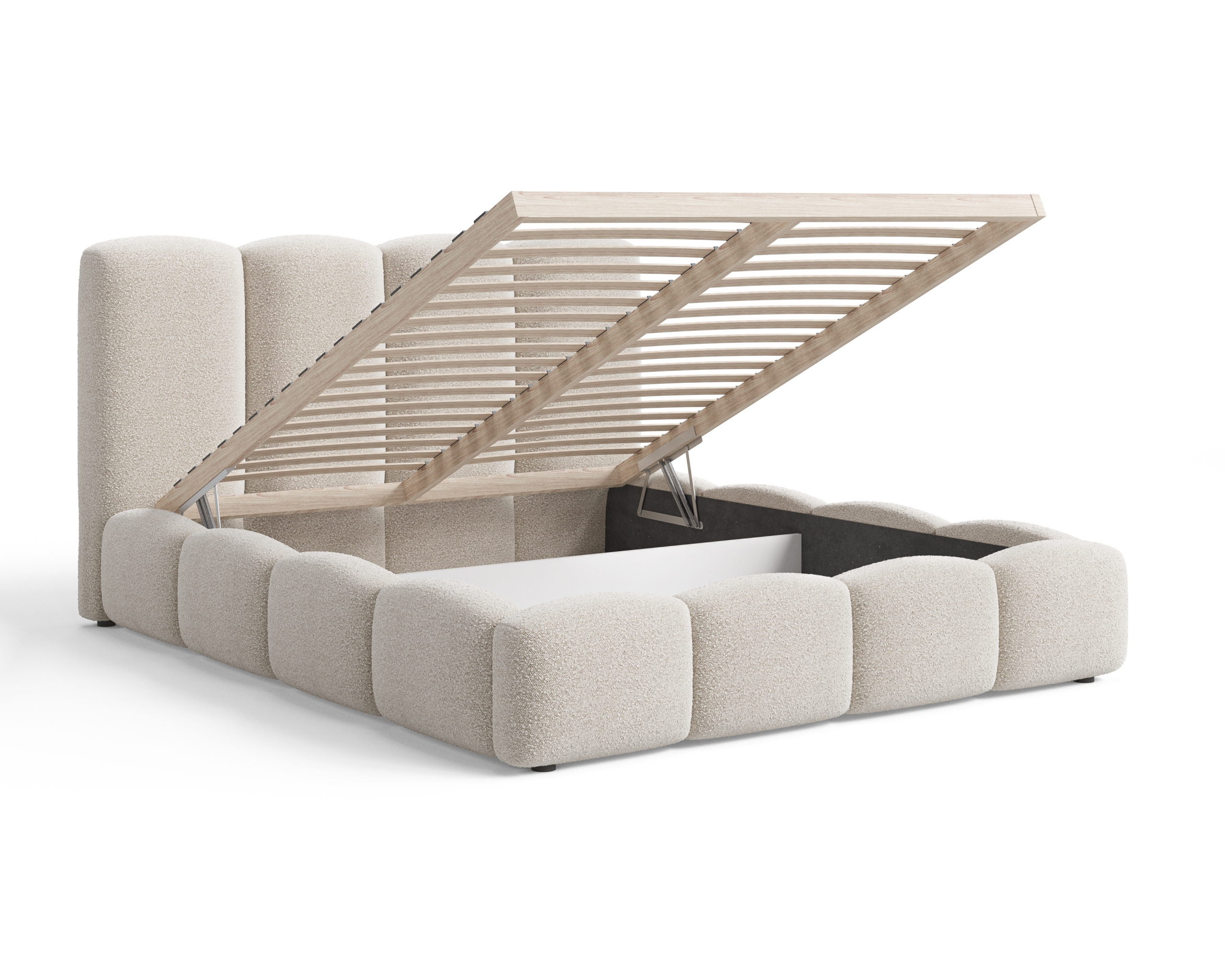 Łóżko zostało obite tkaniną boucle – miękki baranek, niezwykle przyjemną w dotyku i idealną do nowoczesnych wnętrz. Gruba, miękka pianka zastosowana na całej konstrukcji zapewnia wysoki komfort codziennego użytkowania oraz wygodny wypoczynek.