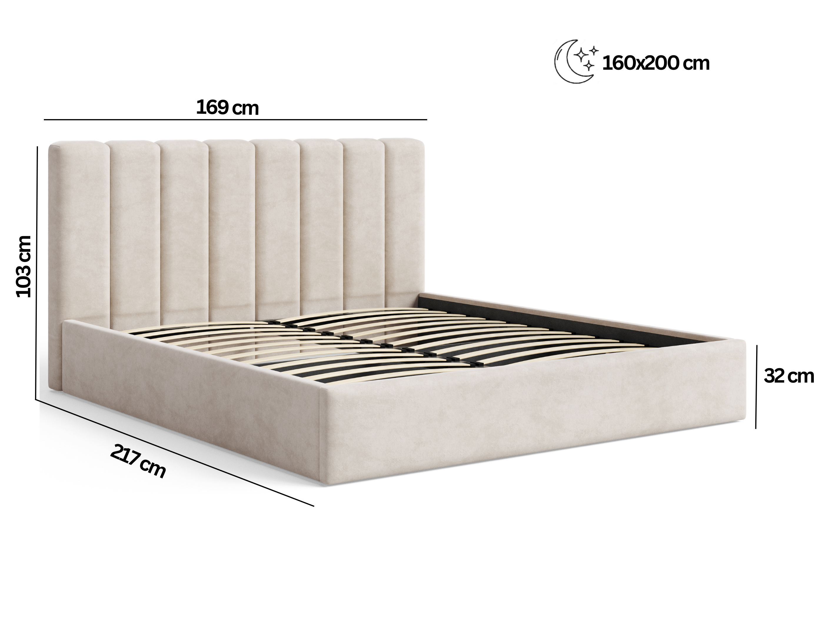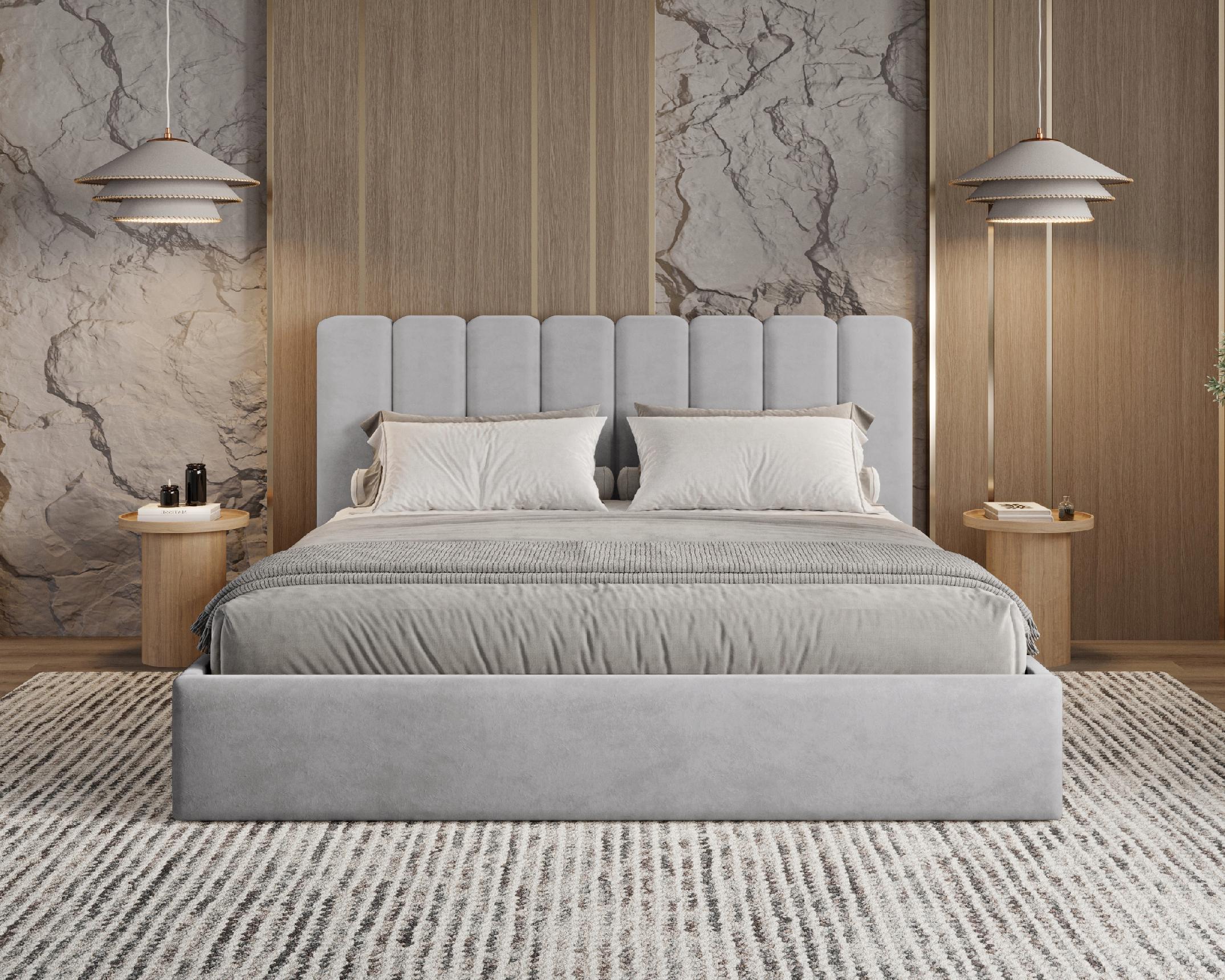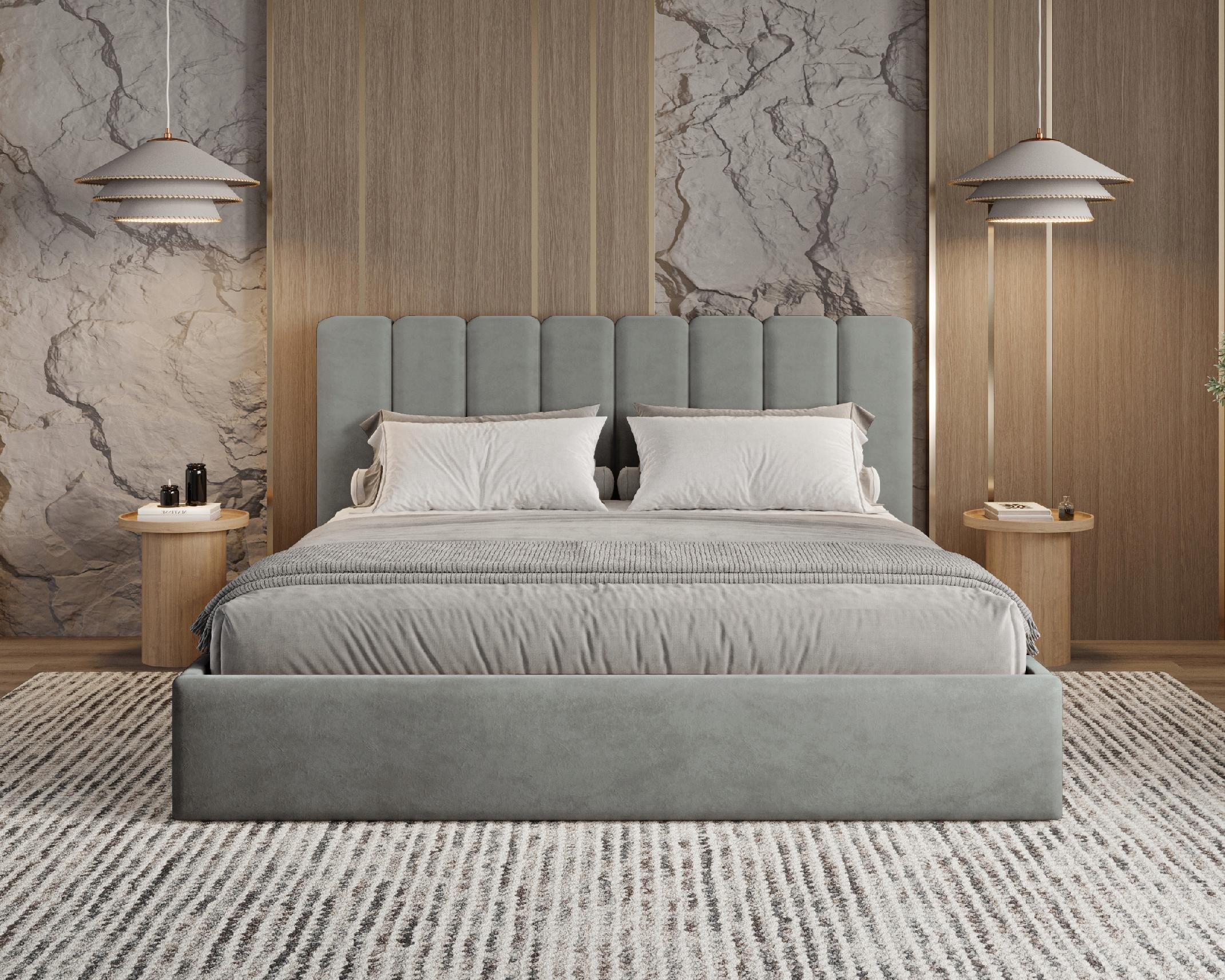 Model Nuvia został obity tkaniną Velutto – miękkim, welurowym materiałem o delikatnym połysku, który zachwyca elegancją i przyjemną w dotyku fakturą. Tkanina ta jest odporna na ścieranie, dzięki czemu łóżko zachowa swój nienaganny wygląd przez wiele lat.