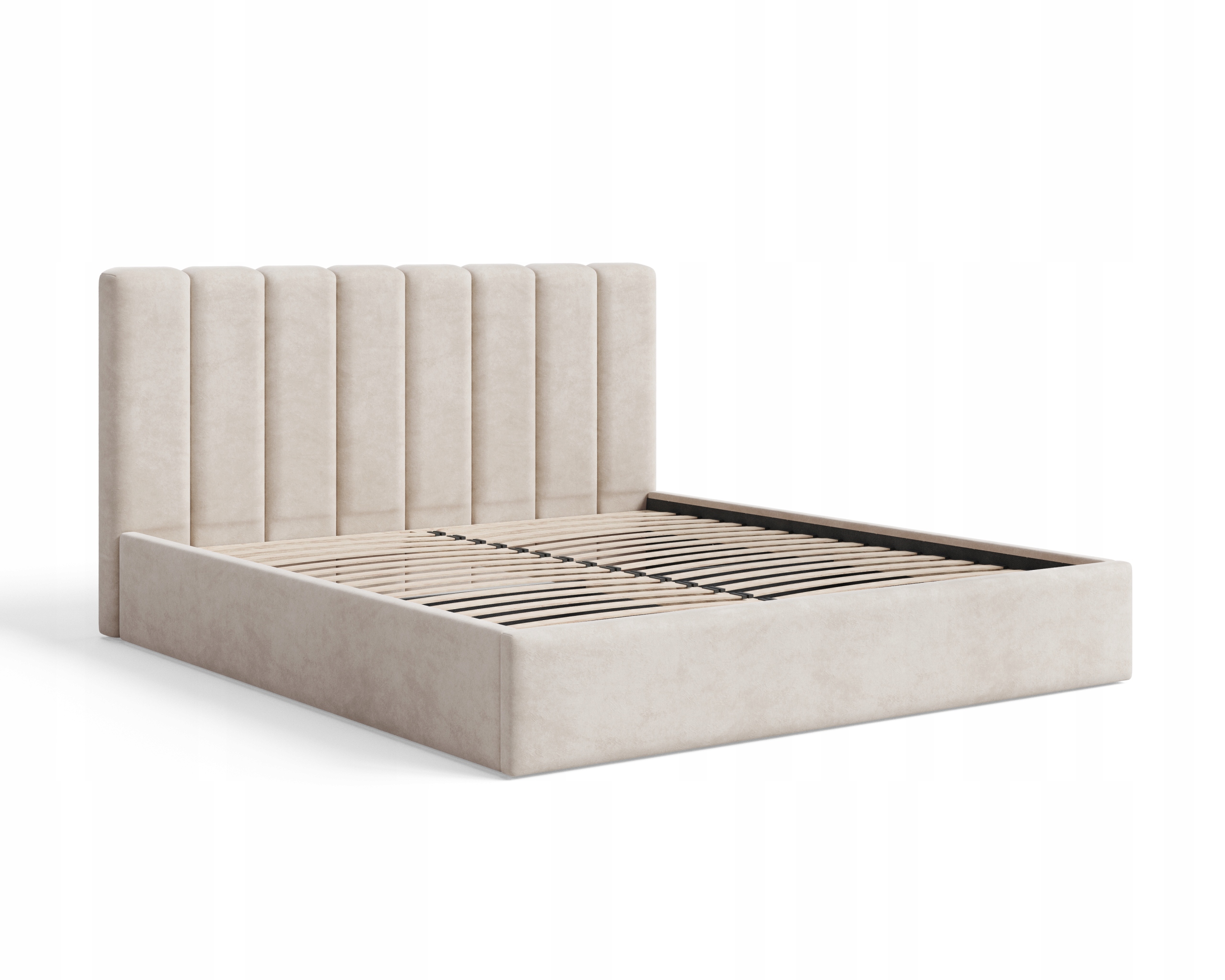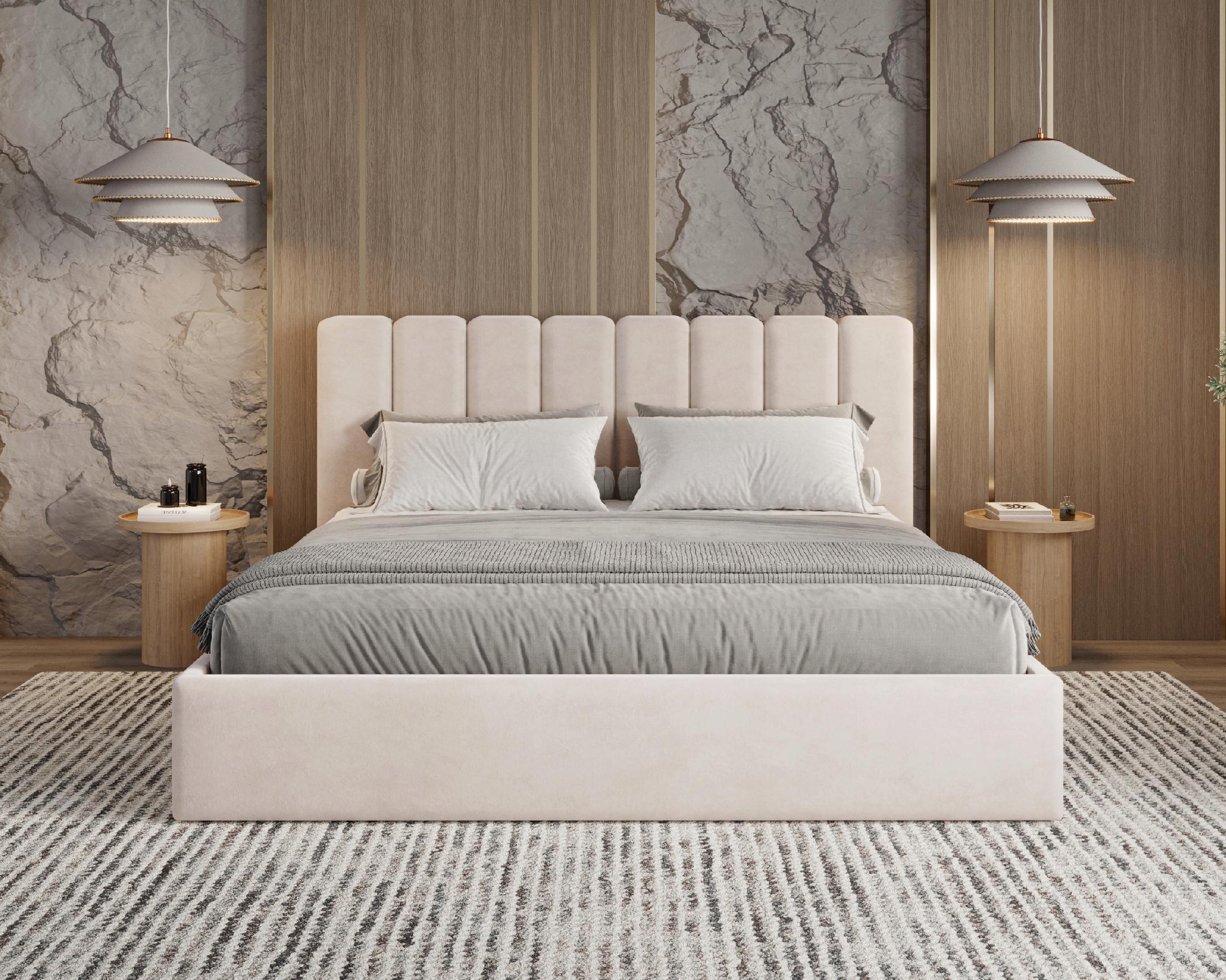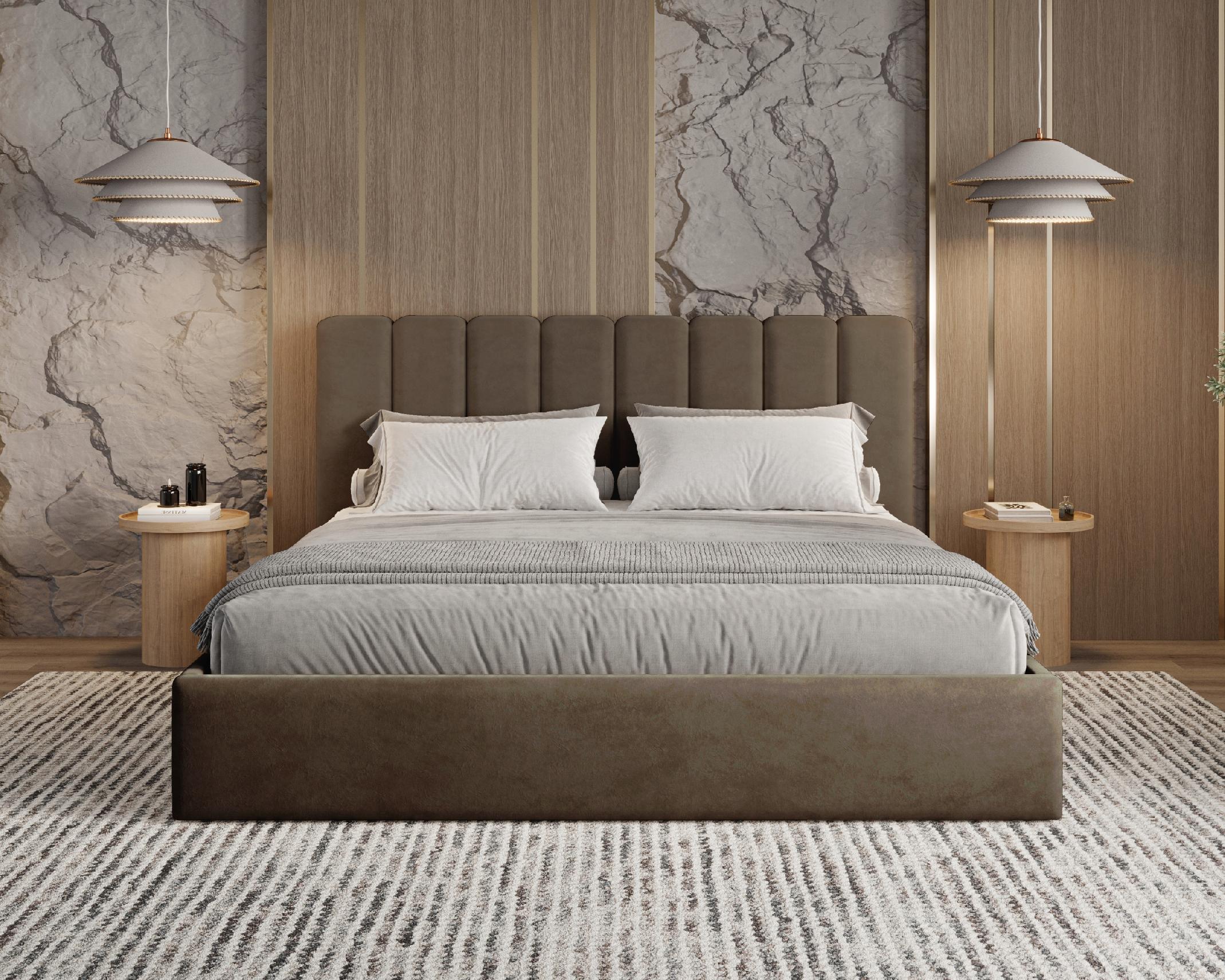 Slim łóżko Nuvia wyróżnia się obłym wezgłowiem z miękkimi, pionowymi pasami, które nadają mu przytulnego i harmonijnego charakteru. Subtelne zaokrąglenia oraz staranne wykończenie sprawiają, że łóżko staje się eleganckim centrum każdej sypialni.
