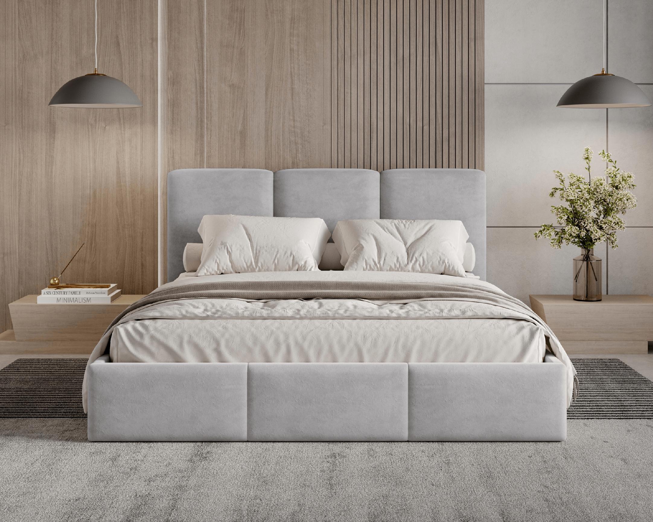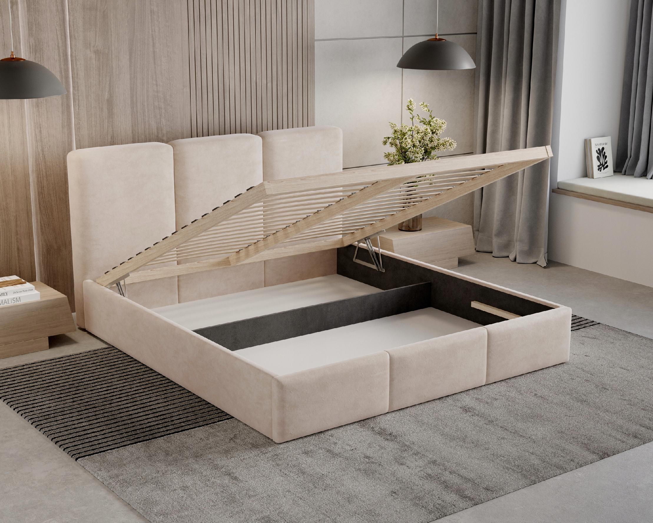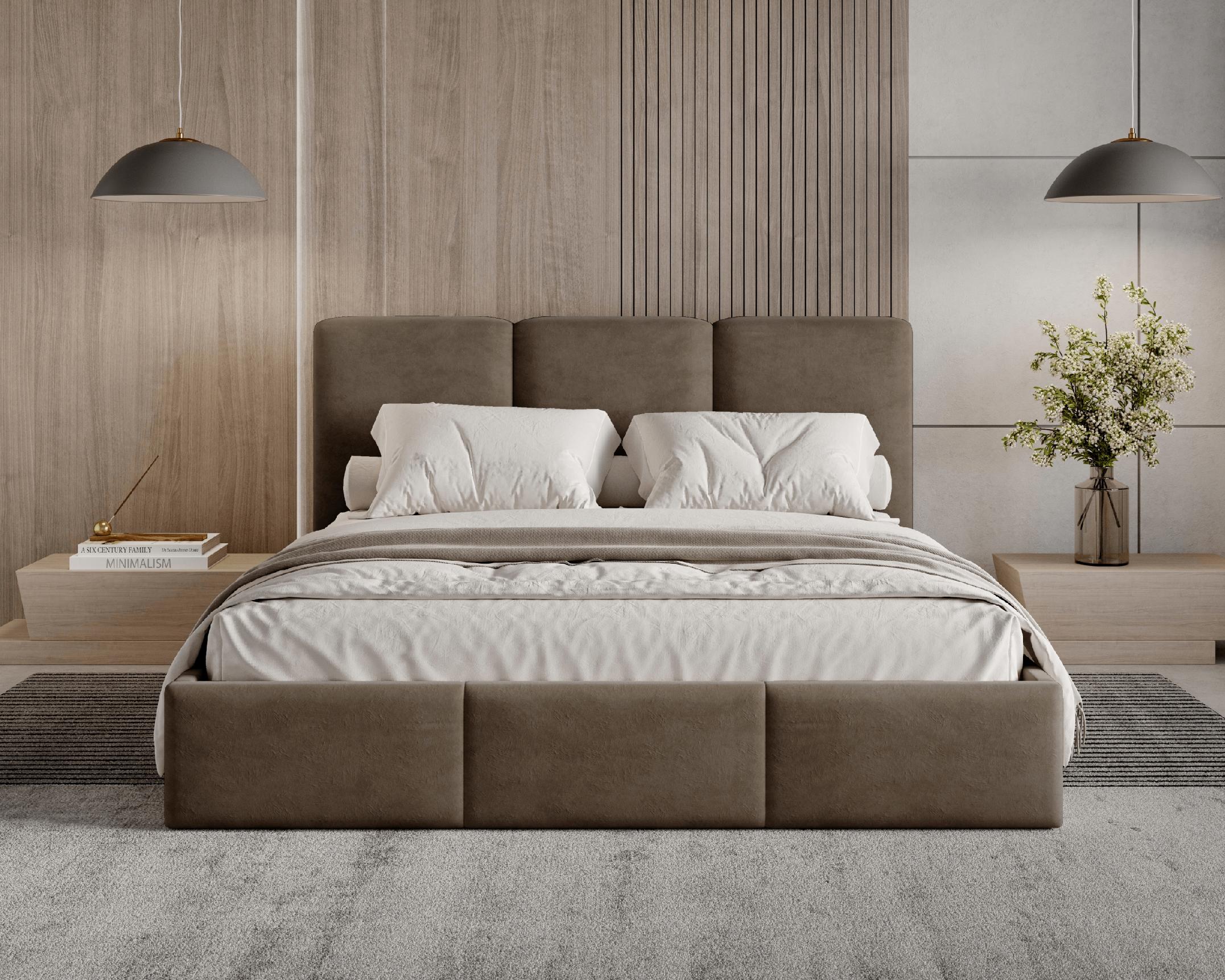 Model z pojemnikiem został obity tkaniną Velutto – miękkim, welurowym materiałem o delikatnym połysku, który zachwyca elegancją i przyjemną w dotyku strukturą. Tkanina ta jest odporna na ścieranie, dzięki czemu łóżko zachowa swój nienaganny wygląd przez lata. To idealny wybór dla osób, które cenią minimalistyczny design, komfort i perfekcyjne wykonanie w każdym detalu.