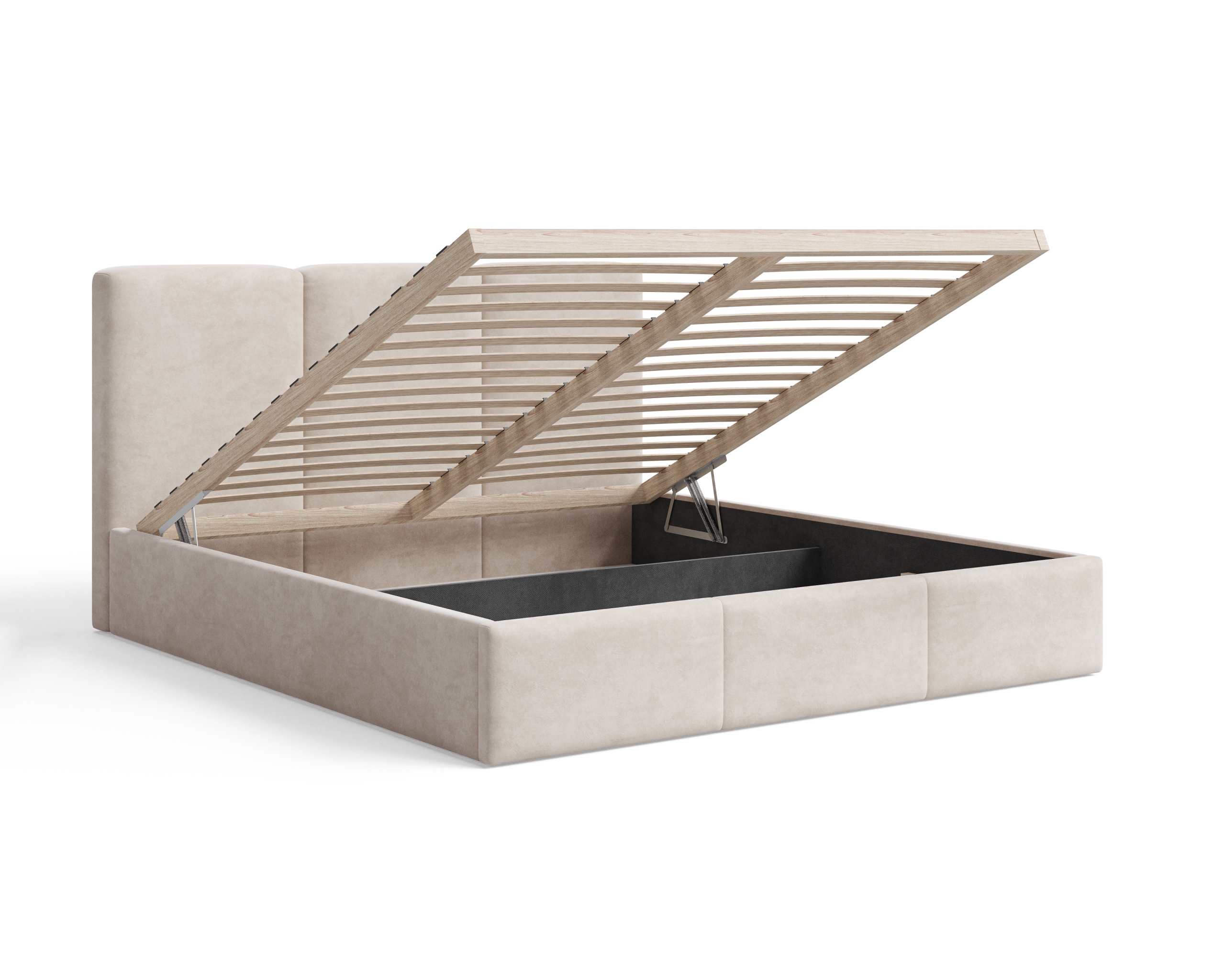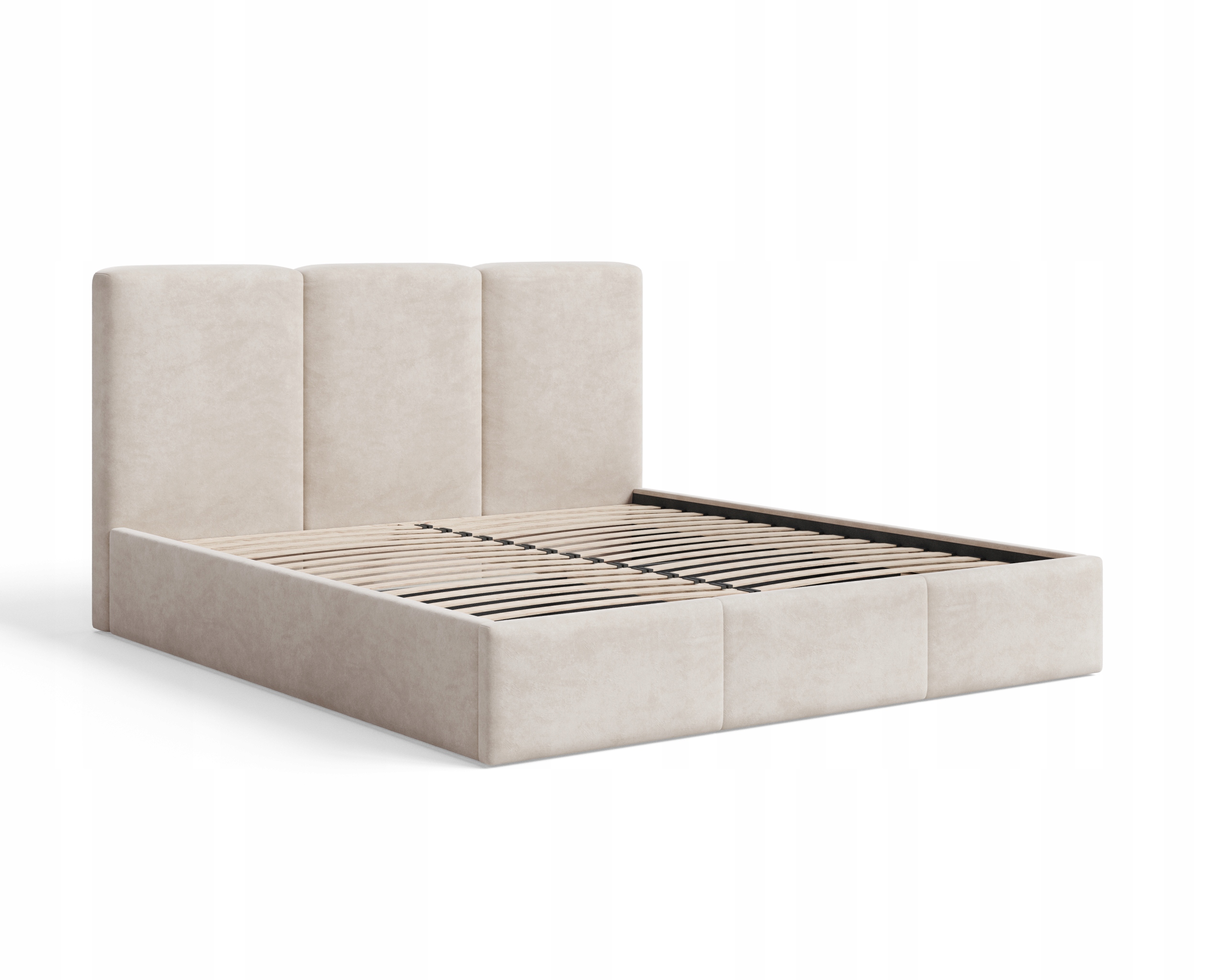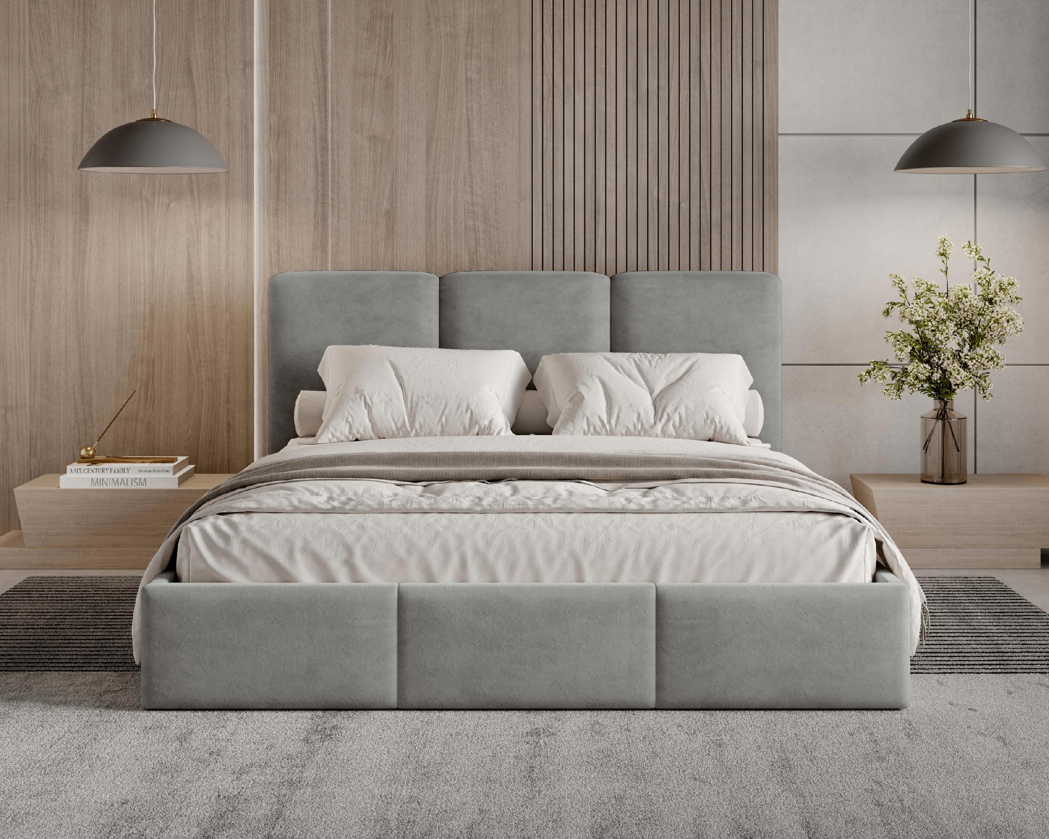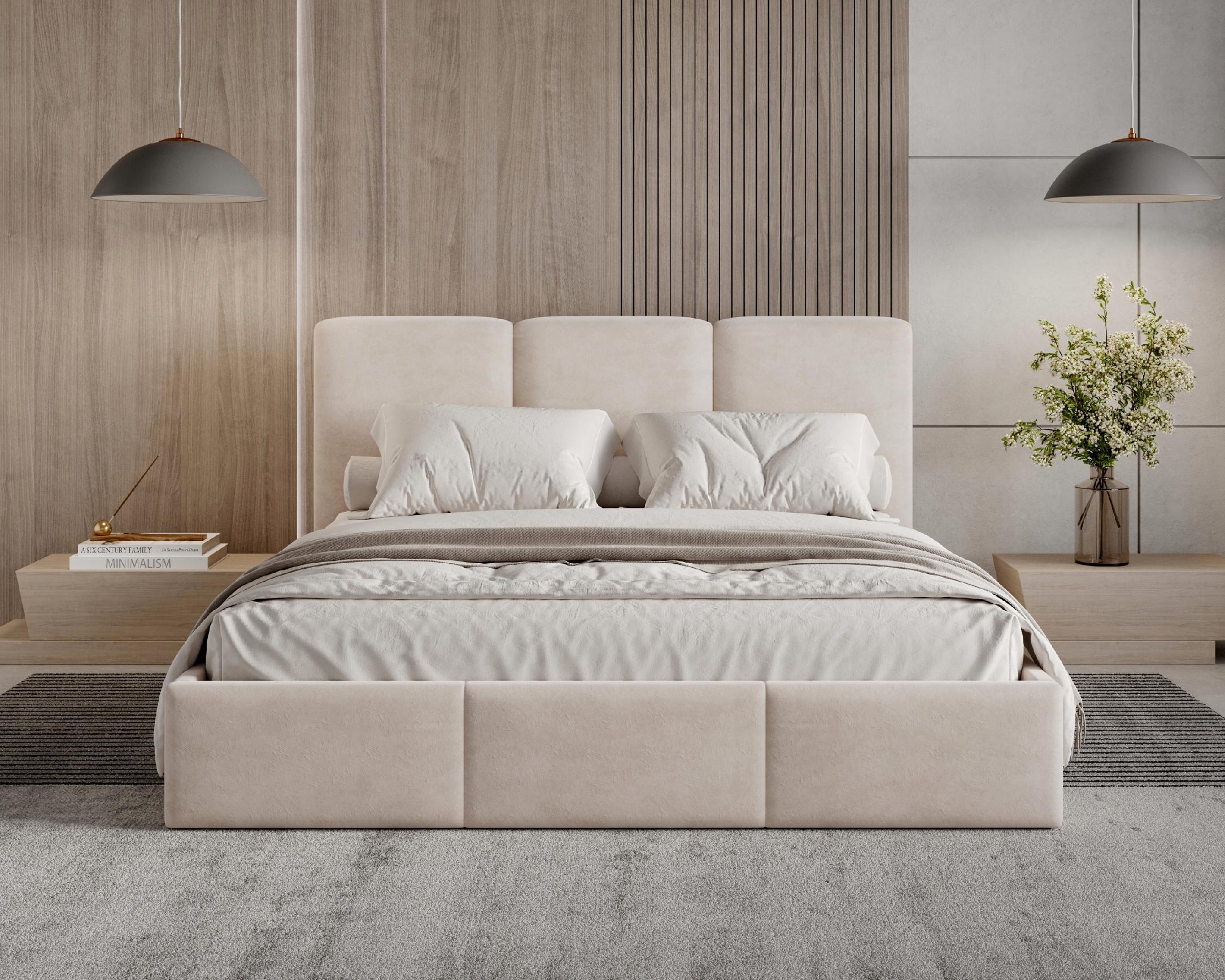Model z pojemnikiem został obity tkaniną Velutto – miękkim, welurowym materiałem o delikatnym połysku, który zachwyca elegancją i przyjemną w dotyku strukturą. Tkanina ta jest odporna na ścieranie, dzięki czemu łóżko zachowa swój nienaganny wygląd przez lata. To idealny wybór dla osób, które cenią minimalistyczny design, komfort i perfekcyjne wykonanie w każdym detalu.