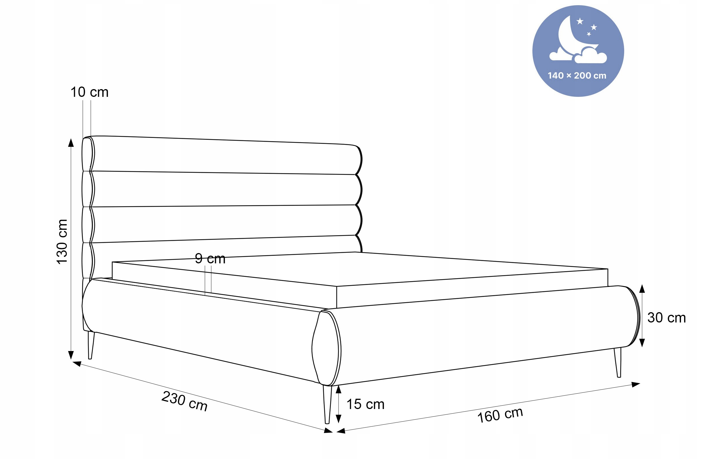 Łóżko sypialniane 140x200 Marbela II to idealny wybór dla osób ceniących nowoczesny design, komfort i wysoką jakość wykonania. Charakterystyczne poziome półwałki na wezgłowiu oraz obłe kształty nadają mu luksusowy wygląd, a smukłe wysokie metalowe nogi podkreślają jego lekkość i elegancję.