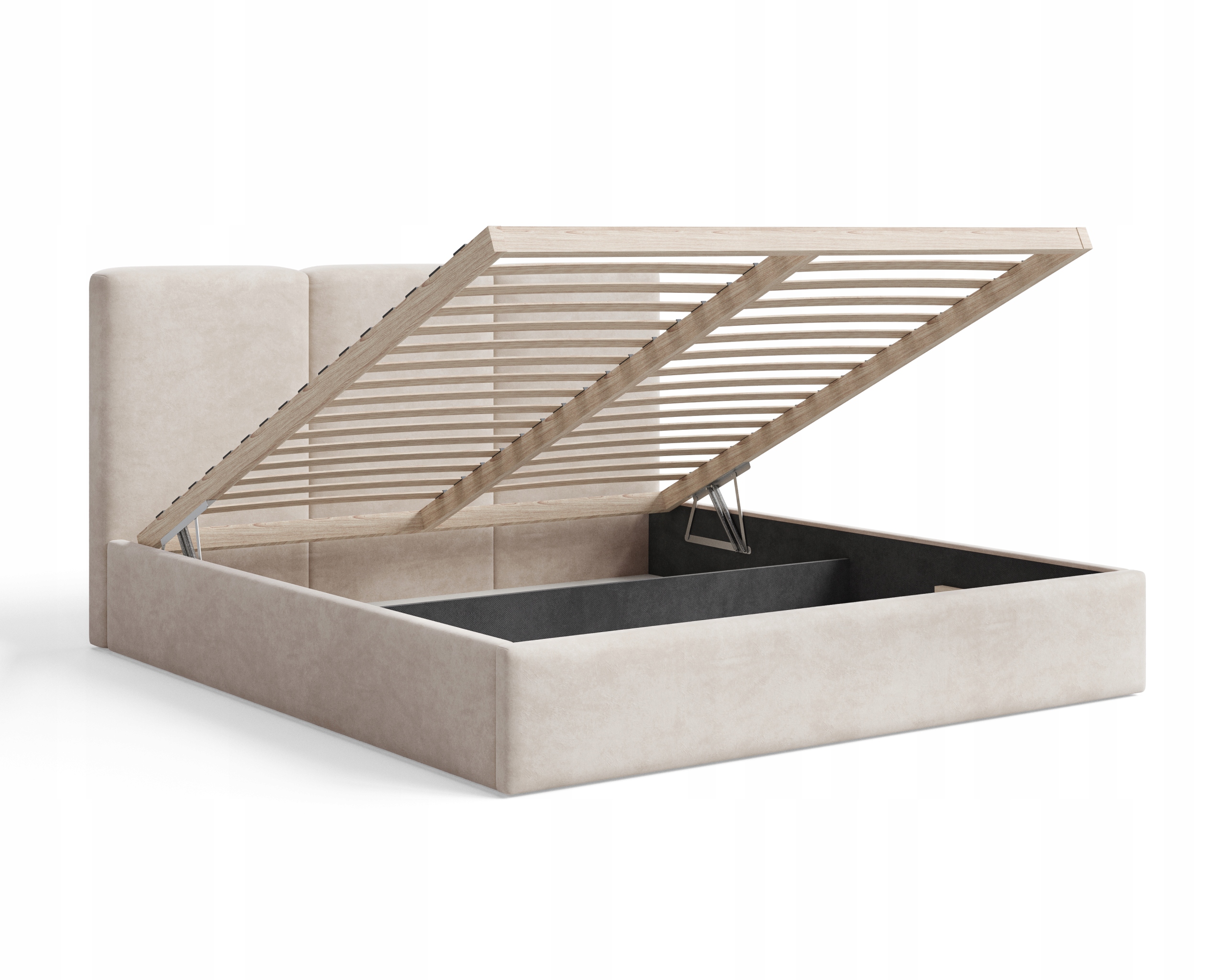 Łóżko sypialniane zostało wyposażone w duży pojemnik na pościel wykonany ze sztywnej białej płyty, który zapewnia praktyczne miejsce do przechowywania kołder, poduszek i innych tekstyliów. W zestawie znajduje się drewniany stelaż na sprężynach.