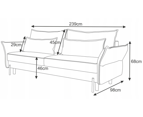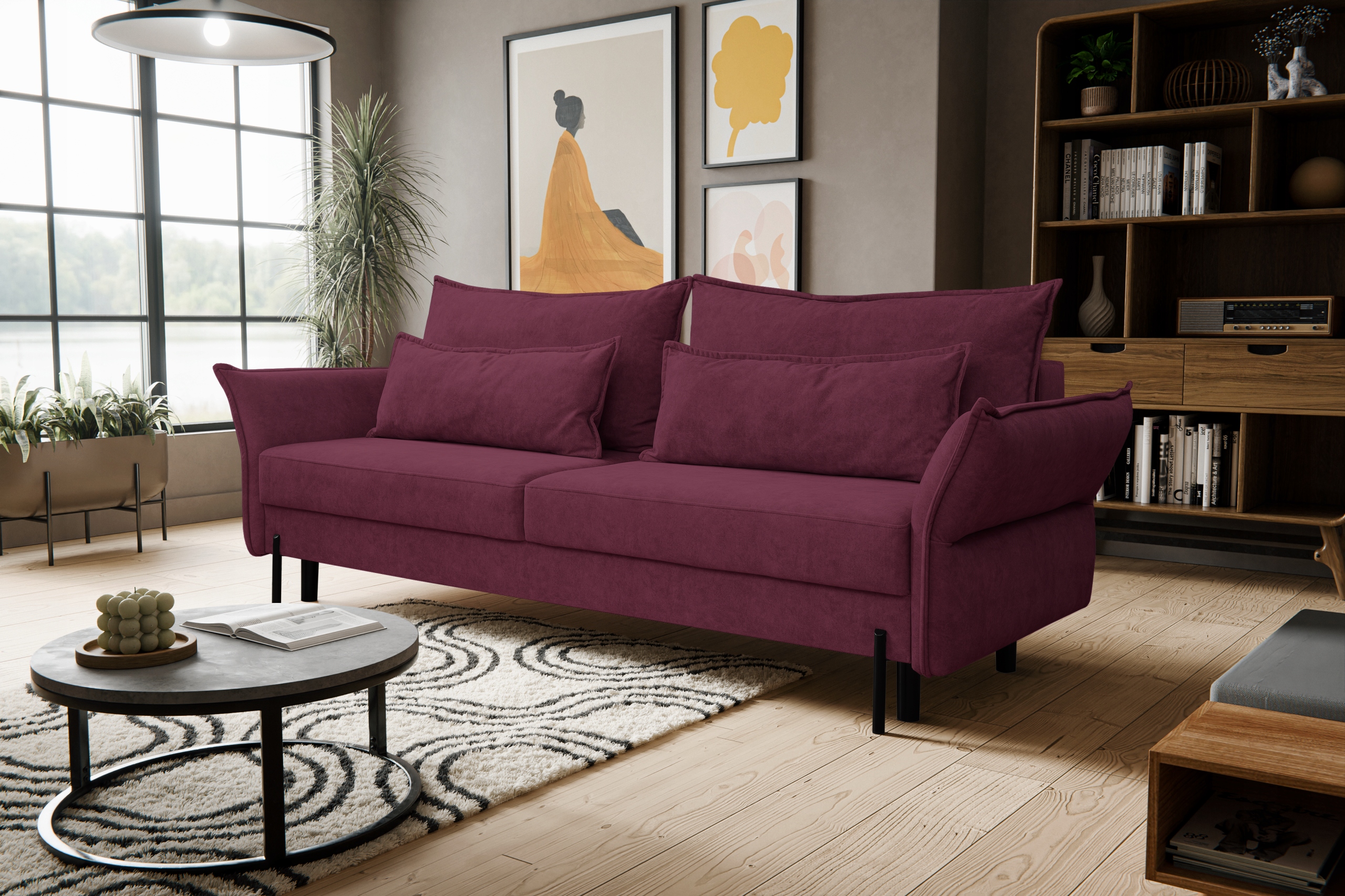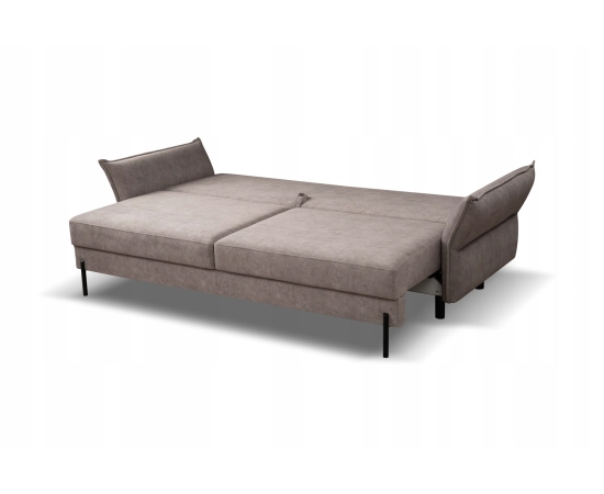 Sofa rozkładana Vilio z funkcją spania typu DL to połączenie stylu i funkcjonalności. Wyposażona w pojemnik na pościel, sprawdzi się doskonale w małych przestrzeniach, gdzie liczy się każdy centymetr. Luźne, duże poduszki oparciowe oraz dwie poduszki lędźwiowe, wypełnione kulkami silikonowymi, zapewniają komfort i podparcie.