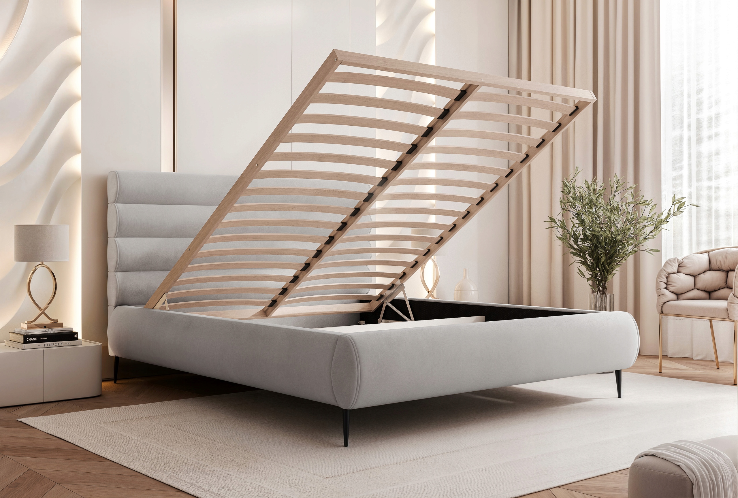 Model wyposażono w stelaż drewniany na sprężynach, który zapewnia stabilne i wygodne podparcie dla materaca. Łóżko 200 z dużym pojemnikiem na pościel, idealnym do przechowywania kołder, poduszek i innych tekstyliów – praktyczne rozwiązanie do każdej sypialni.