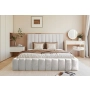 Łóżko tapicerowane Tina 200x200 to elegancki i funkcjonalny wybór do każdej sypialni. Wyposażone w pojemnik na pościel, zapewnia dodatkową przestrzeń do przechowywania kołder i poduszek. Osadzone jest na niskich ślizgach, co nadaje mu stabilności i minimalistycznego wyglądu. Zagłówek łóżka zdobią pionowe pasy wykonane z grubej pianki, które dodają mu stylu oraz zapewniają wygodę podczas wypoczynku. Konstrukcja oparta na cienkim szkielecie typu slim sprawia, że łóżko jest lekkie, ale jednocześnie wytrzymałe i solidne.