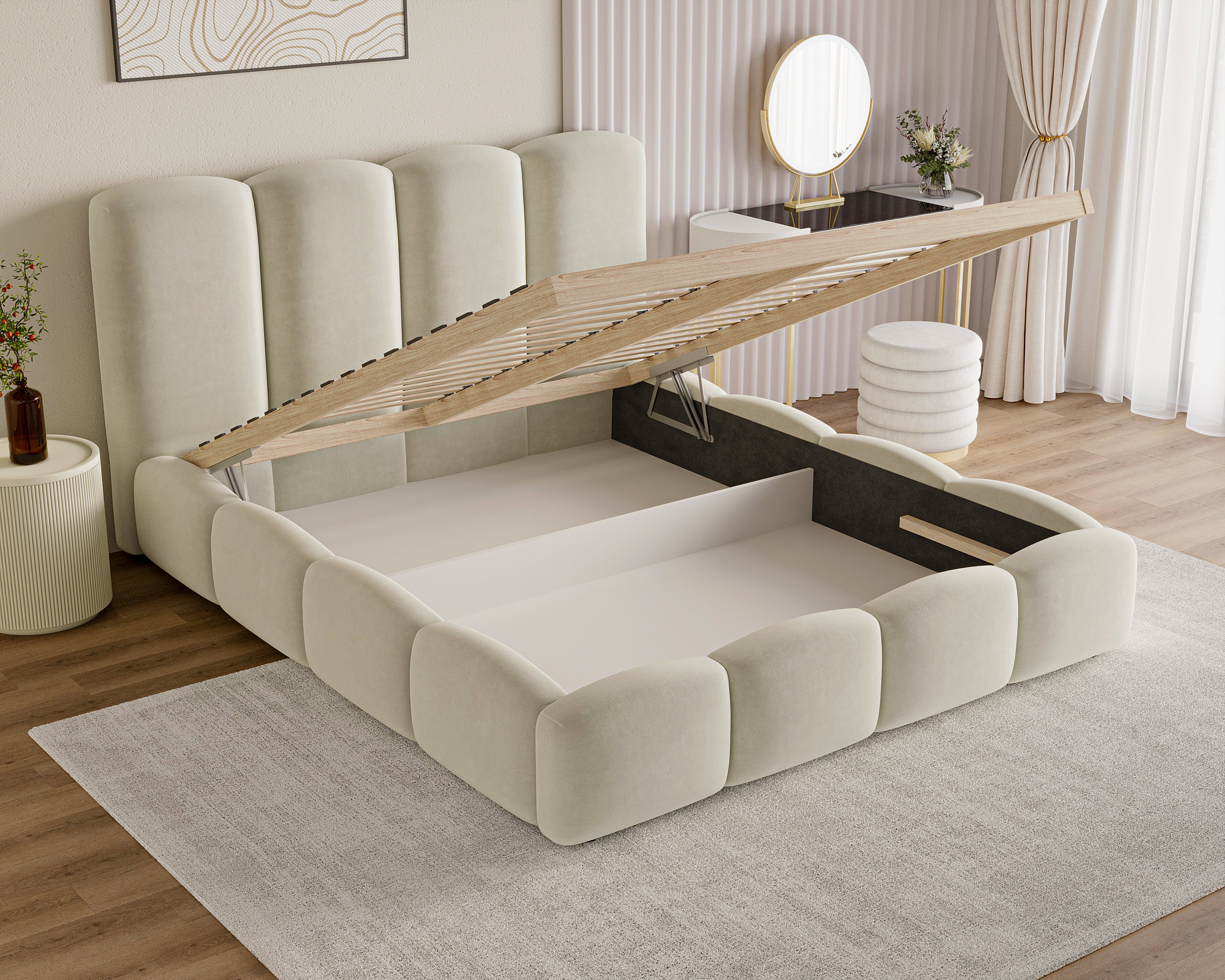 W zestawie znajduje się praktyczny pojemnik na pościel oraz solidny, drewniany stelaż, który gwarantuje odpowiednie podparcie dla materaca. Dla osób poszukujących jeszcze większej wygody, dostępna jest opcja dokupienia metalowego stelaża z podnośnikiem gazowym. Łóżko tapicerowane 140x200 Puffy to idealna propozycja do sypialni urządzonej w stylu minimalistycznym, skandynawskim lub modern soft. Jego nietuzinkowy wygląd sprawia, że może stać się centralnym punktem każdego wnętrza.