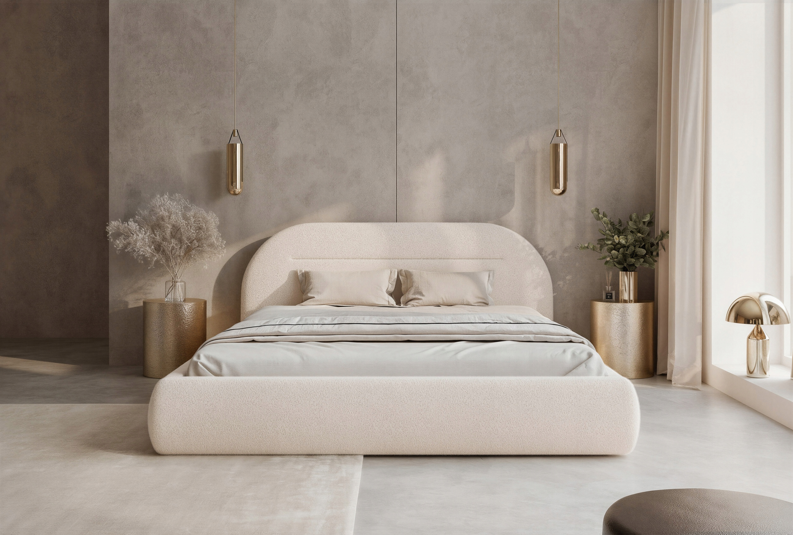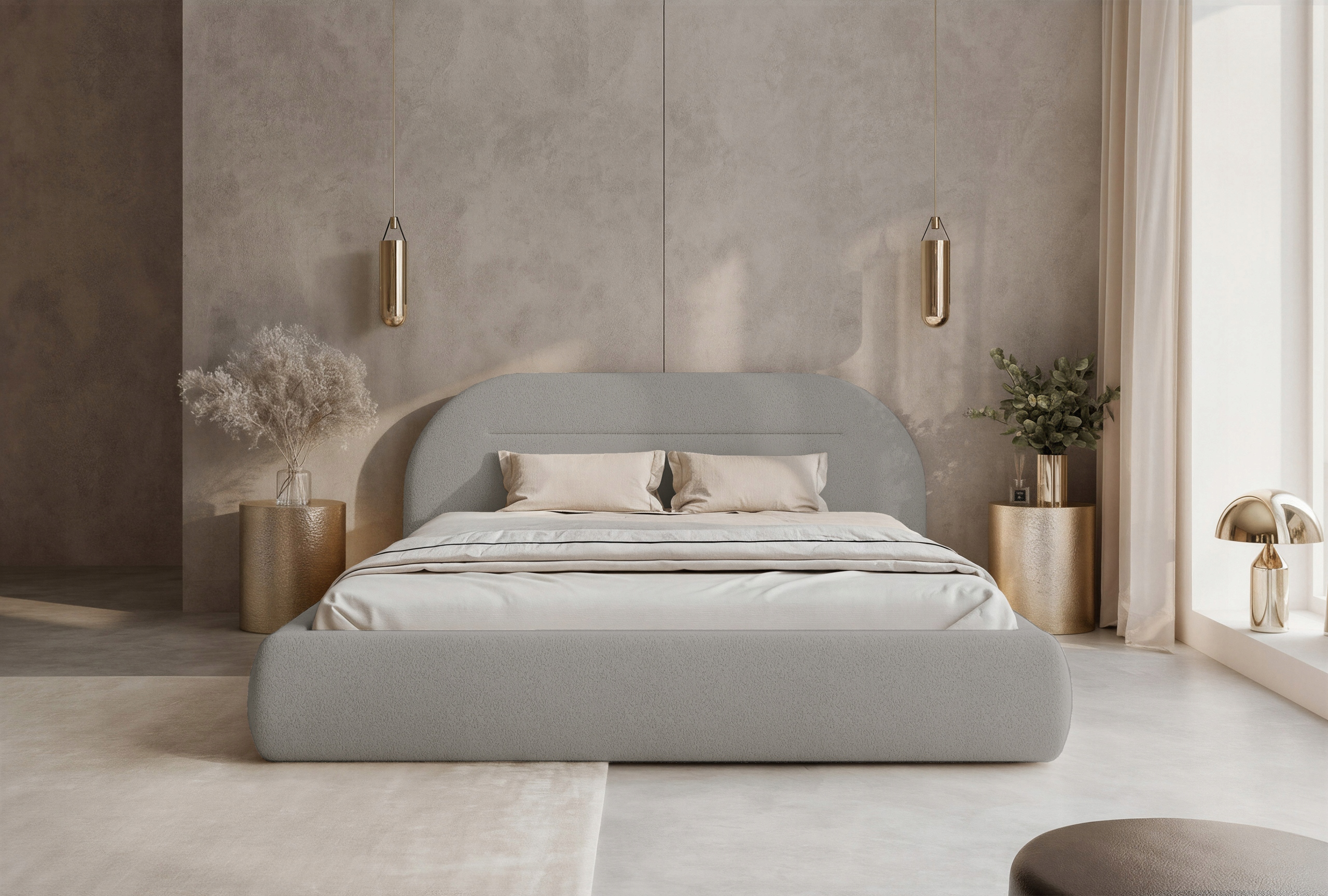 Łóżko tapicerowane Apolline to nowoczesne i eleganckie łóżko sypialniane 160x200, które wyróżnia się modnym półokrągłym wezgłowiem oraz obłą, harmonijną ramą nadającą wnętrzu przytulny i stylowy charakter. Model został obity miękką, przyjemną w dotyku tkaniną pluszową Monte, która podkreśla komfort i nowoczesny wygląd mebla.