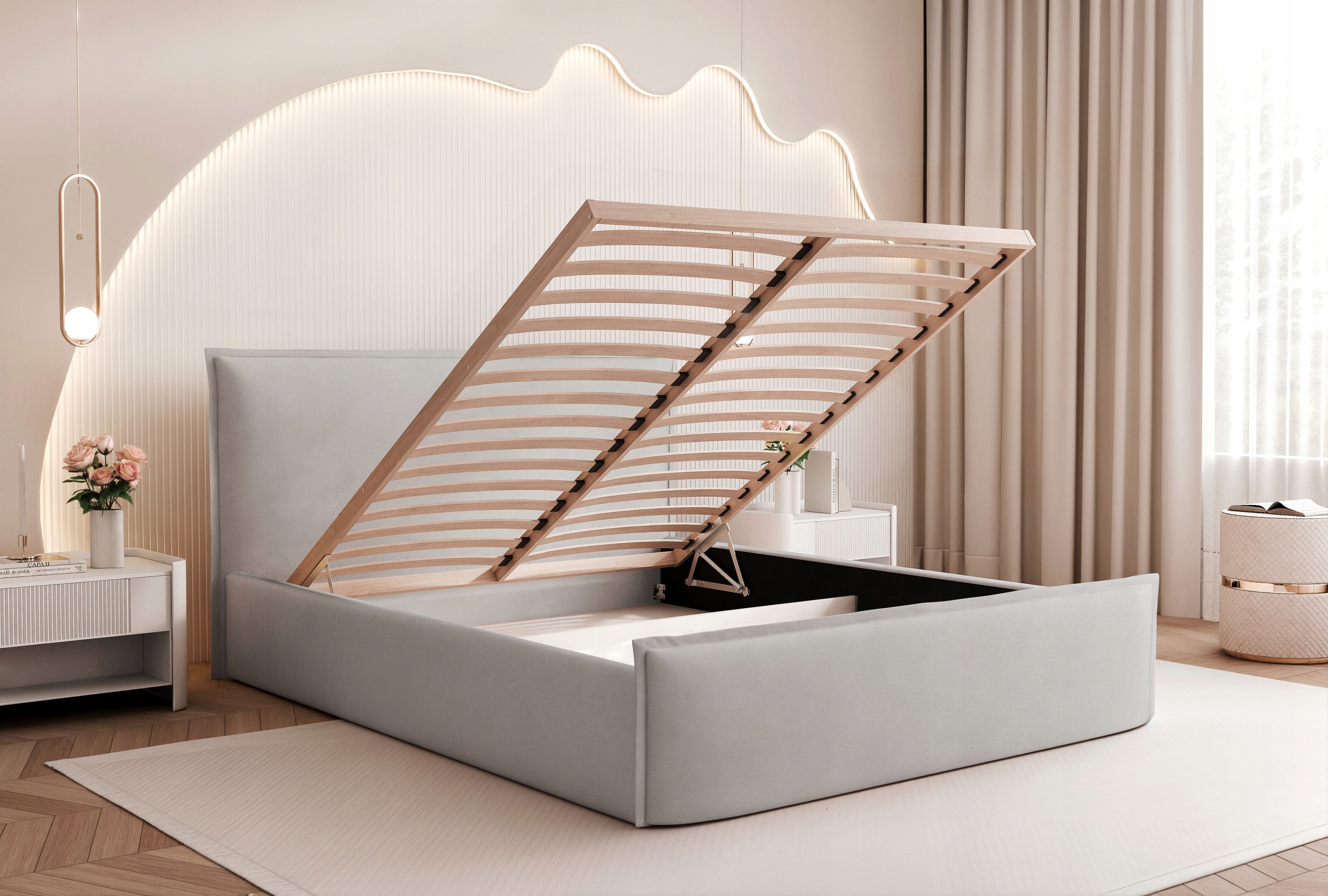 Dzięki temu, że całość została osadzona na praktycznych ślizgach, mebel prezentuje się lekko i nowocześnie. Dodatkowym atutem jest pojemny schowek na pościel, który zapewnia wygodne miejsce do przechowywania kołder, poduszek czy innych tekstyliów.