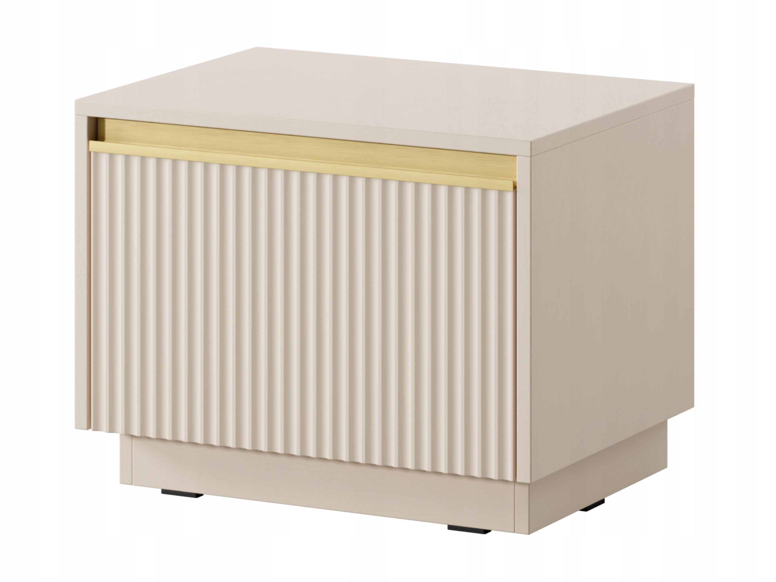 Szafka do sypialni LAMI o subtelnym, minimalistycznym wyglądzie. Wykonana z wysokiej jakości materiałów, posiada delikatne ryflowane fronty, które nadają jej wyjątkowy charakter. Złote uchwyty subtelnie kontrastują z jasną barwą szafki, dodając jej luksusowego wyrazu. Wnętrze małej szafki wyposażone jest jedną dużą szufladę, która zapewnia dużo miejsca na różnorodne przedmioty. Dodatkowym atutem szafki są 2 opcje rozmieszczenia mebla. Szafka nocna 50 cm LAMI może być stojąca, bądź może wisieć na ścianie. Idealna do sypialni– wszędzie tam, gdzie liczy się styl i praktyczność.