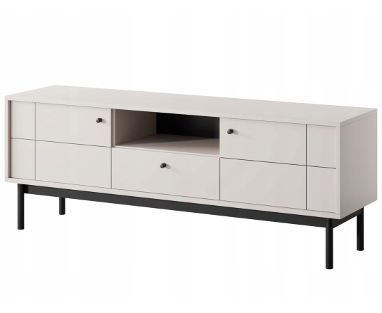 Szafka do salonu na wysokich, czarnych nogach to elegancki mebel, który łączy w sobie funkcjonalność i minimalistyczny design. Wyposażona w dwie pary drzwiczek, za którymi znajdują się liczne półki, oferuje dużą przestrzeń do przechowywania. Dodatkowo, na dole szafki umieszczono jedną praktyczną szufladę, która doskonale sprawdzą się do organizacji drobnych przedmiotów. Jasna kolorystyka korpusu w połączeniu z ciemnymi akcentami nóżek nadaje jej stylowy wygląd, idealny do nowoczesnych wnętrz. Kaszmirowa szafka RTV dwudrzwiowa jest nie tylko estetyczna, ale także trwała i stabilna, dzięki solidnej konstrukcji i wysokiej jakości materiałom. To doskonały wybór dla osób ceniących praktyczne rozwiązania w eleganckiej oprawie.