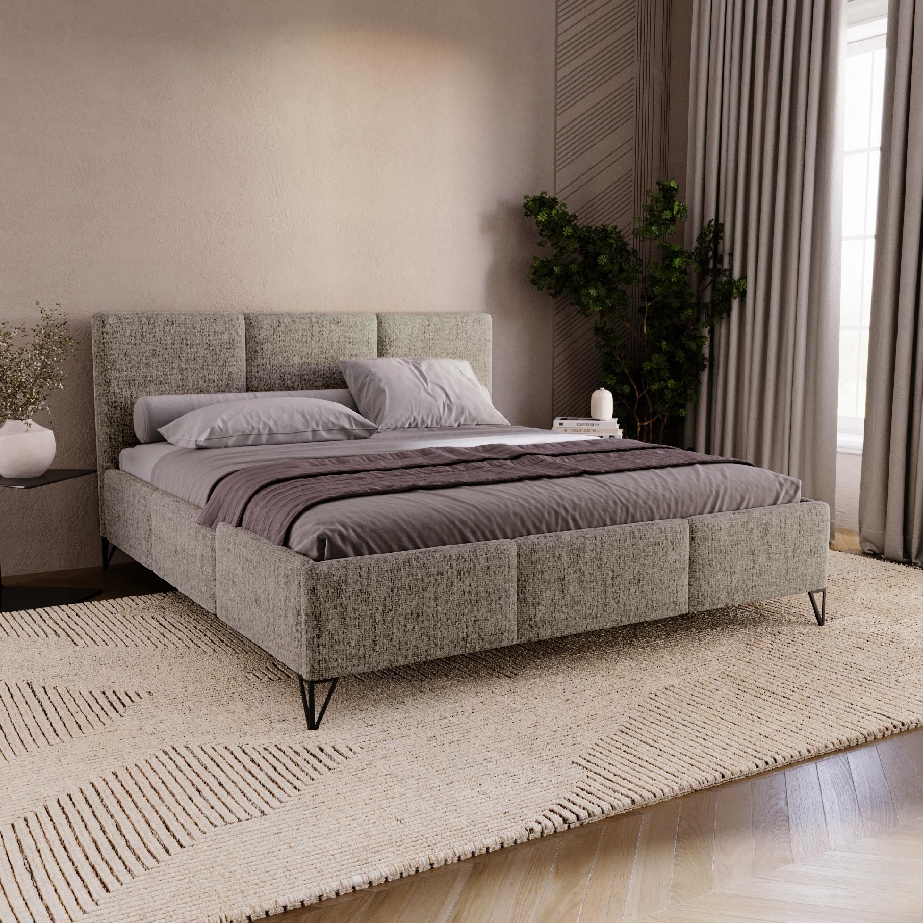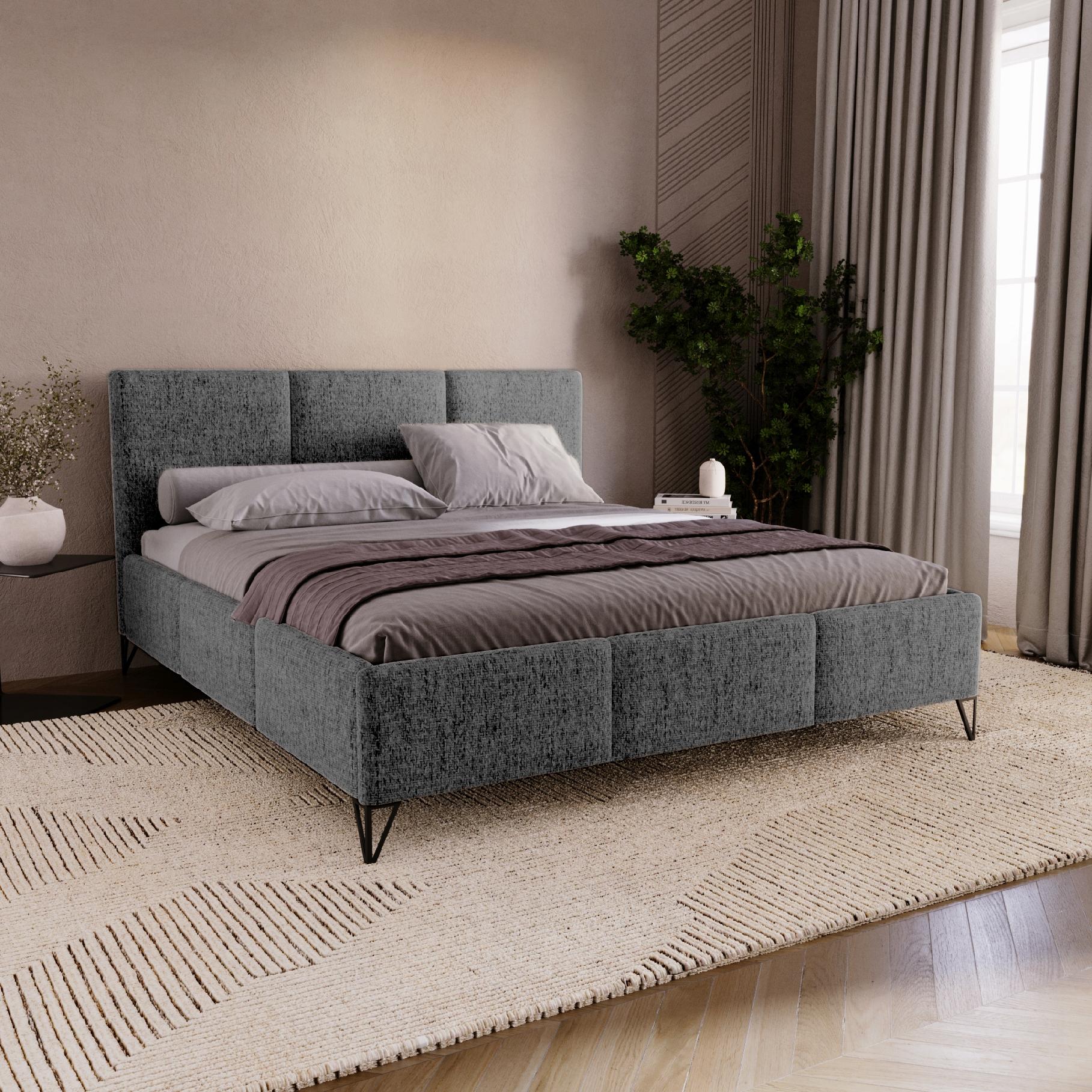 Łóżko tapicerowane podwójne posiada praktyczny pojemnik na pościel, który umożliwia wygodne przechowywanie. Smukłe, metalowe nogi nadają mu nowoczesny wygląd i zapewniają stabilność. Szenilowe łóżko Jenifer to doskonały wybór dla osób ceniących minimalistyczny styl, komfort i funkcjonalność w aranżacji sypialni.