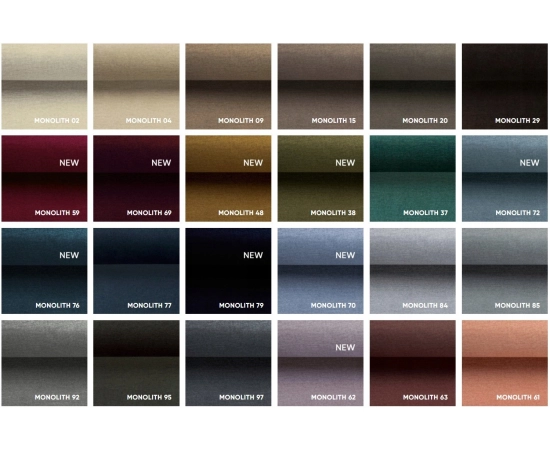 MONOLITH to mocny i jednocześnie miły w dotyku materiał obiciowy. Wzbogacony specjalną powłoką hybrydową, która zabezpiecza przed wnikaniem cieczy w strukturę tkaniny. To również świetna tkanina dla dzieci i materiał odporny na zwierzęta.