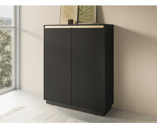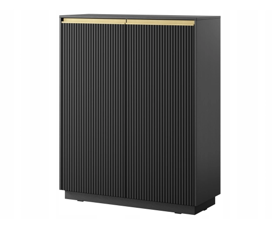 Wysoka komoda o subtelnym, minimalistycznym wyglądzie. Wykonana z wysokiej jakości materiałów, posiada fronty z delikatnymi pionowymi żłobieniami, które nadają jej wyjątkowy charakter. Złote uchwyty subtelnie kontrastują z ciemną barwą komody, dodając jej luksusowego wyrazu. Wnętrze wyposażone jest w sześć przestrzeni na przechowywanie, co zapewnia dużo miejsca na różnorodne przedmioty, a dodatkowe półki zwiększają funkcjonalność mebla. Dzięki zamykanym drzwiczkom można łatwo zachować porządek i estetykę. Idealna do salonu, sypialni lub biura – wszędzie tam, gdzie liczy się styl i praktyczność.